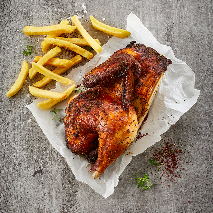 Dansk Gårdkylling af racen "Ranger Gold" grillet i vores "wood fired" BBQ pit. Enkelt - men genialt! Spicy Rub, BBQ, FIRE & Smoke!